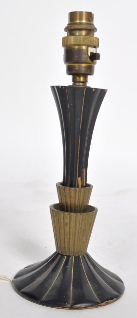 A vintage 20th Century Art Deco carved oak ebonised table lamp of classic Deco style having brass worked decoration. All raised on a circular base. Sold as untested by ourselves. Measures approx; 28cm x 11cm diameter.