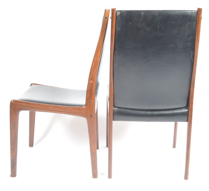 Johannes Andersen for Mogens Kold - A set of eight retro vintage Danish Afromosia teak wood dining chairs, organically shaped of high back, padded black leather seat and rest. Wear commensurate with age. Measures approx; 93cm x 51cm x 47cm.