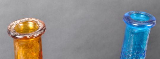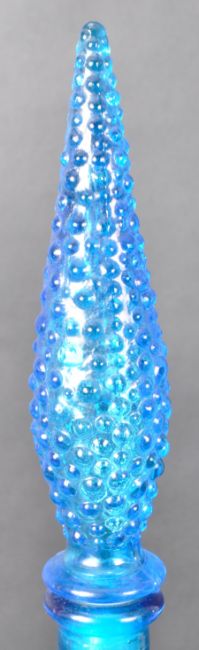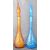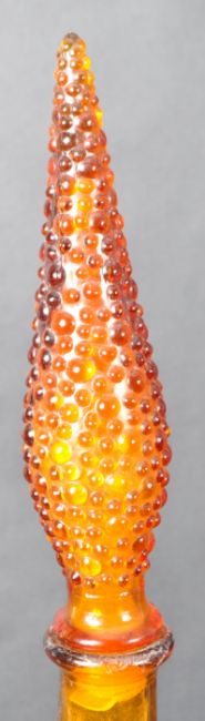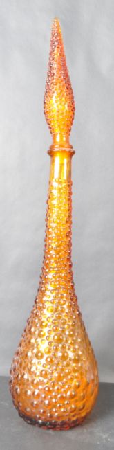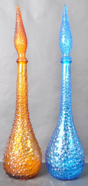 Genie Bottles -Two decorative retro Italian Empoli studio art glass bottles / decanters with each having a textured glass finish with pointed stoppers atop. One finished in orange and the other blue. Each measures approx; 57cm x 13cm diameter.