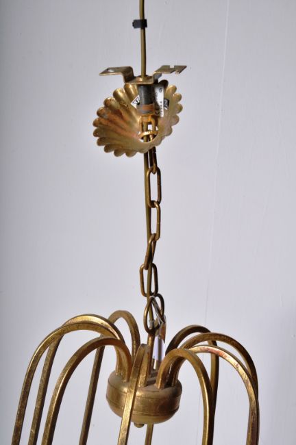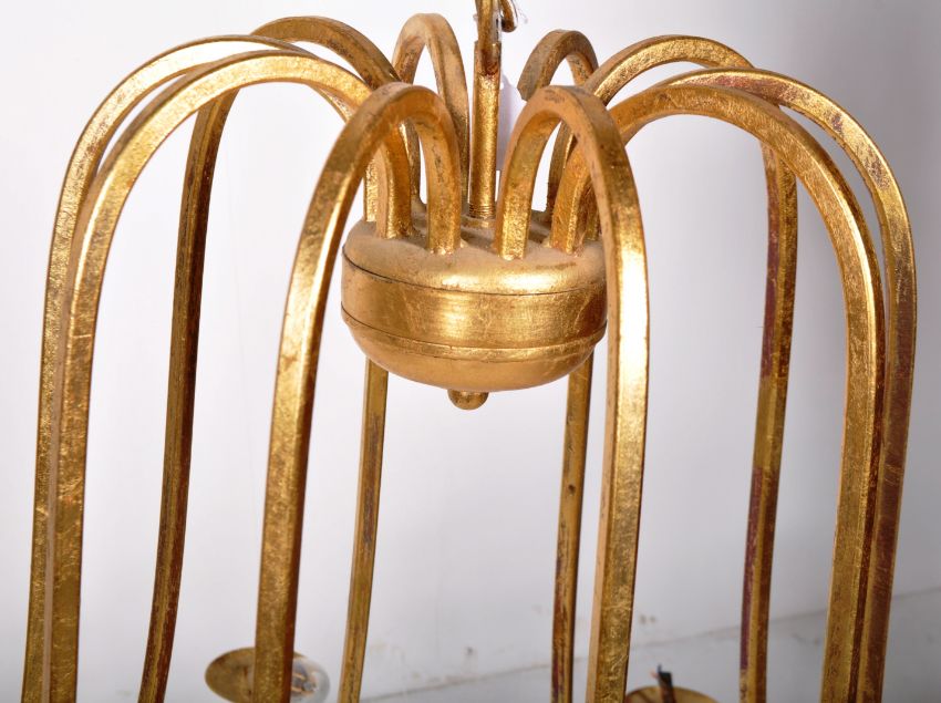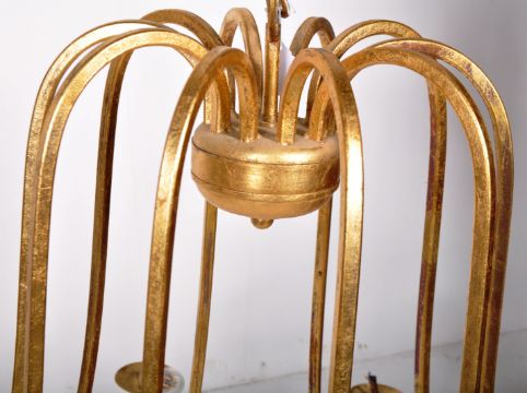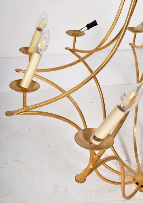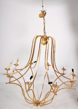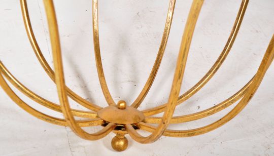 Bella Figura - A contemporary high end designer gilt metal chandelier of bell shaped form having ten slender arms with each having light fitting to the end with drip trays below. Labels present for Bella Figura Lighting. Light fixture atop with all terminating to a ball finial. Measures approx; 110cm x 94cm diameter.