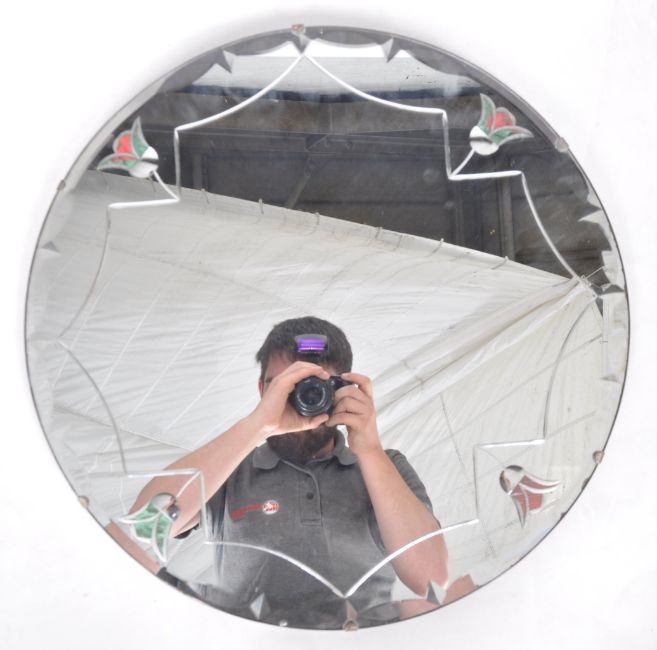 A vintage 20th Century Art Deco frameless mirror of circular form having etched detailing with underlaid coloured decoration. Oak-ply back with hanging rail. Measures approx; 52cm diameter.