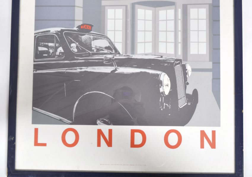 A vintage 20th Century London advertising poster print featuring the iconic black taxi cab parked out front of the Ritz Restaurant. London in big red lettering to the lower margin. Below reading "King Posters - 6 Buckingham Road". Framed and glazed. Measures approx; 94cm x 68cm.