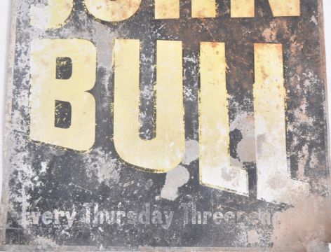 A retro vintage mid 20th Century advertising point of sale shop display lithoplate on tin sign for John Bull. The sign with lettering in bold block colours and central pictorial. Measures approx; 76cm x 51cm.