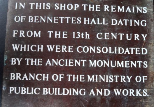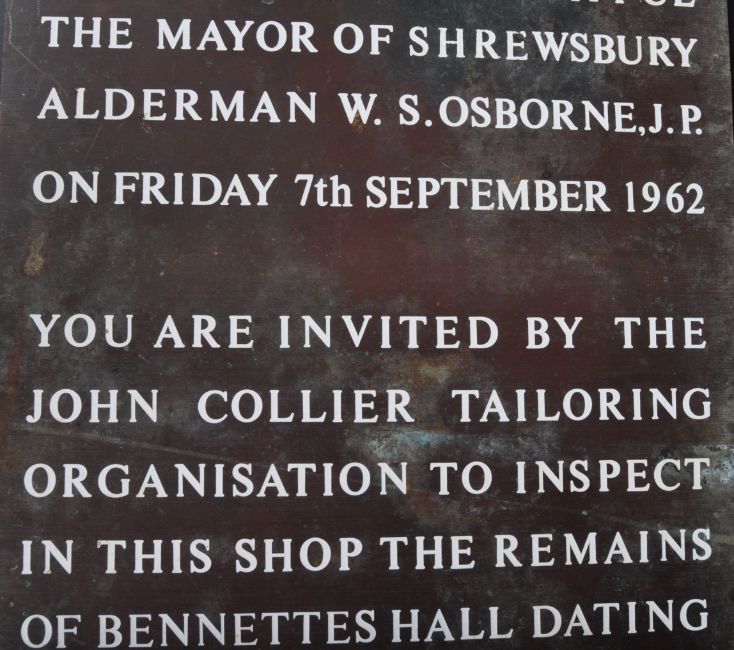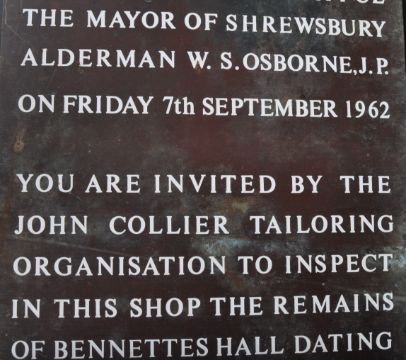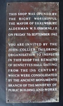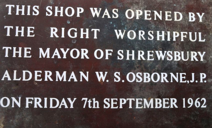 A vintage mid 20th Century 1960s solid bronze wall mounted plaque having white writing commemorating the opening of a shop in Shrewsbury. Measures approx; 59cm x 31cm.