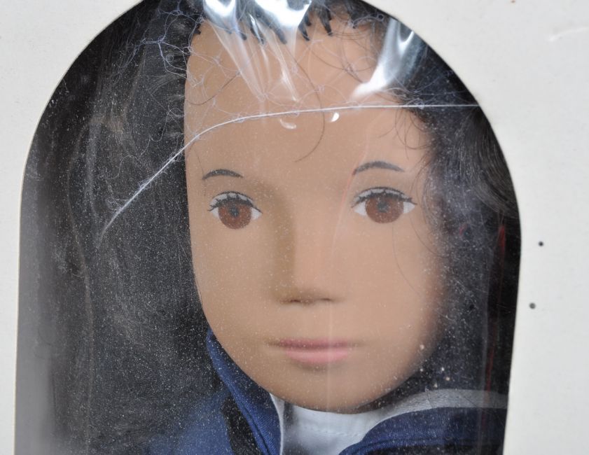 An original vintage circa 1970's vinyl Sasha doll No. 102S ' Sasha Brunette Marina ' with box. The doll having dark brown rooted hair, hand painted eyes and lips with philtrum. White Elastic to the shoulders and brown elastic to the hips. Dressed in blouse, pleated skirt, jacket, pants, long skirt and shoes. Housed within the original box with Sasha doll catalogue.