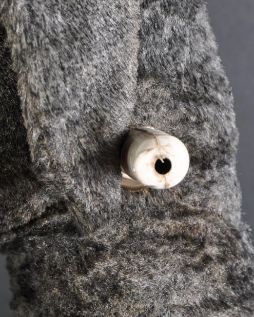 A large vintage ride along / push along soft toy in the form of a poodle. Two tone grey mohair styled and shaved into a poodle cut. Standing on a red metal stand with black rubber wheels. Measures approx 80x90cm including base.