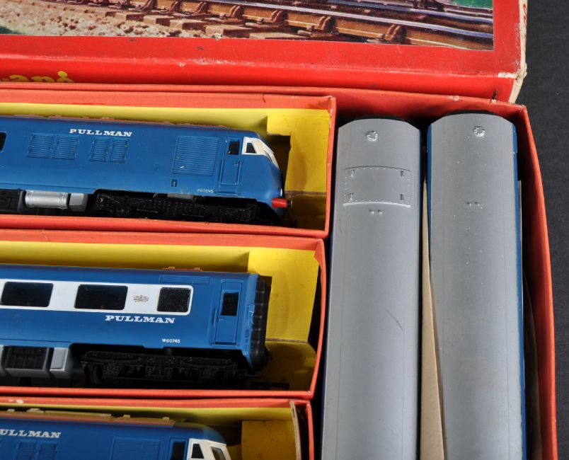 An original vintage Hornby Tri-ang / Triang 00 gauge model railway electric trainset No. RS52 ' The Blue Pullman '. The set containing a Diesel Motor Car, Parlour Car, Dummy Car, carriages, straight and curved track and the original paperwork. Housed within the original box.