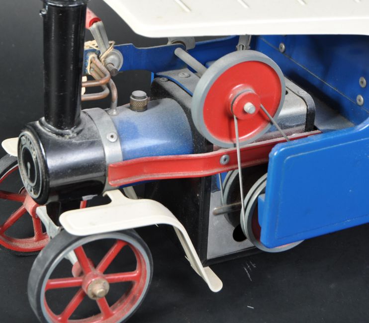 An original vintage Mamod live steam engine model No. SW1 Steam Wagon. A solid fuel example with blue bodywork and red spoked wheels with rubber tyres.