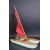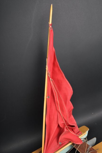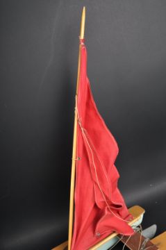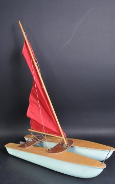A vintage Gen Toy Ltd Sea Rover Catamaran model boat / pond yacht with two parallel hulls of wood and plastic construction with red sails and a metal rudder. Appears VG within original box.