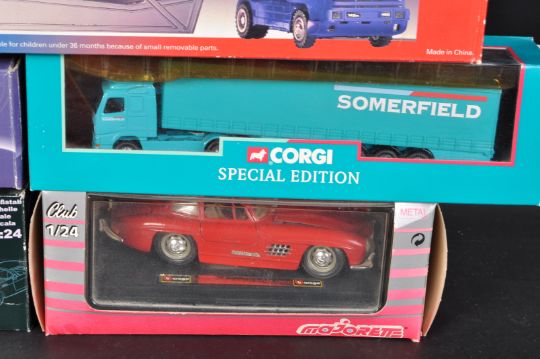 A collection of assorted large scale diecast model cars and haulage vehicles to include; Majorette 1/24 scale Mercedes Benz 500 SL Roadster, Corgi Super Haulers, Volvo Curtainside Ken Abrams, Scania Cab and Curtainside Omega Express and others. Models appearing mint, within original boxes.