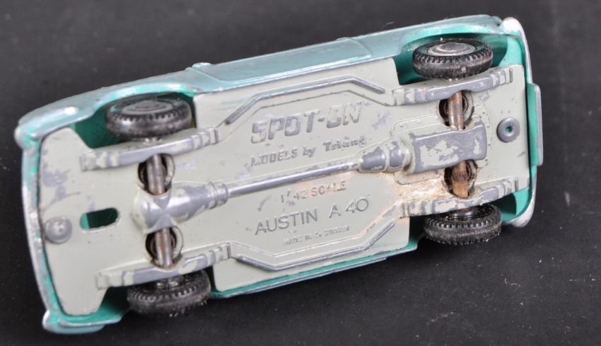 Three original vintage Triang made Spot-On 1/42 scale diecast model cars comprising; x2 Austin A40 and an Austin Seven. Models appearing in Fair condition.