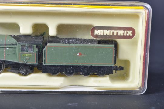 An original Hornby Minitrix N gauge model railway trainset locomotive engine No. 211 Mallard 60022 in British Railways green. Detailed loco within original box.