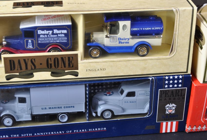 A large collection of assorted Lledo Days Gone and Matchbox Models of Yesteryear diecast model cars and other vehicles. Largely advertising related with public transport and haulage examples. Some multipacks also present.