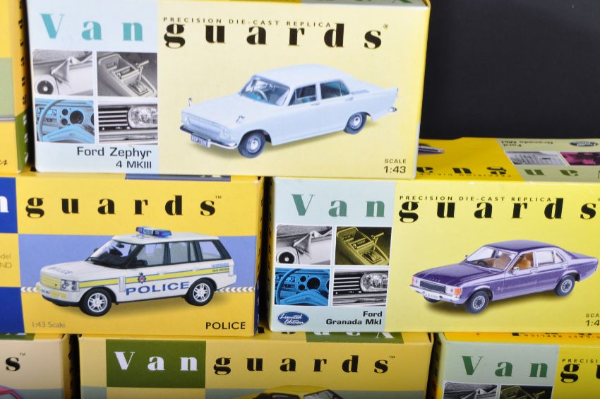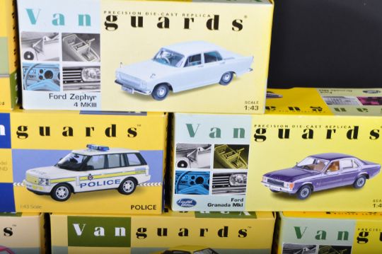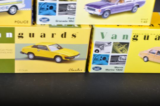 A collection of x10 assorted 1/43 scale Lledo made Vanguards diecast model cars to include; VA10307 Ford Cortina MKIII, VA05208 Ford Granada MKI, VA06000 Ford Zephyr and others. Models appearing mint within original boxes.
