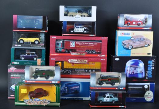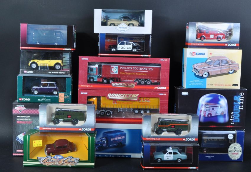 A large collection of assorted Corgi made diecast model cars, trucks and other haulage vehicles. Examples to include; Roadside CC18205 1/76 scale Mercedes Actros Curtainside Jack Richards, 15007 Scammell Scarab Guinness, AN01101 Brown Ford Consul Saloon and others.
