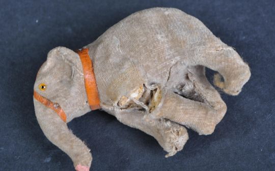 A set of five early 20th Century c1910/1920s model circus elephant figures. Wooden / composition construction, each covered in felt, with miniature leather straps, each pinned in place. Featuring small orange and black glass eyes and presumed glass inserts for tusks. Highly detailed, and made to a high standard. Likely German in origin, but no makers marks present. Each measures approx; 6.5cm tall.