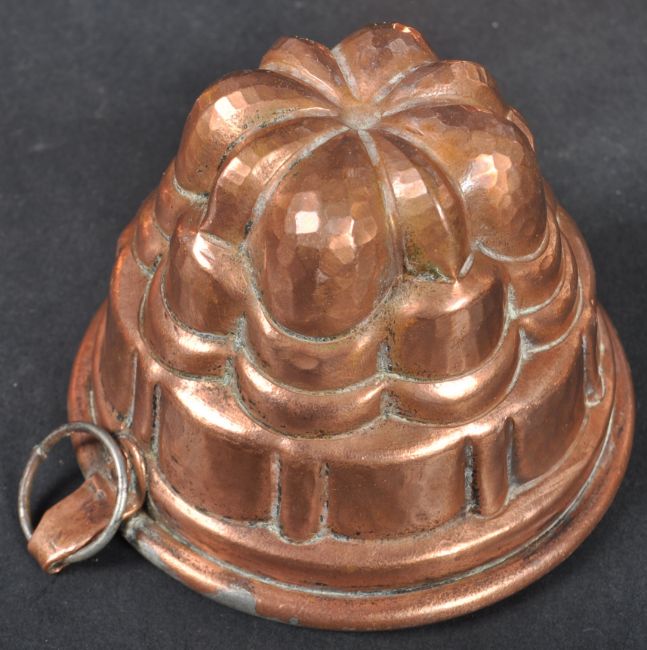 A collection of 20th Century Edwardian copper graduating jelly molds / sweet confectionary chocolate molds comprising spiral example and reeded edges, some with fruit etc. Wear commensurate with age to all. Largest measures approx; 12cm x 19cm diameter.