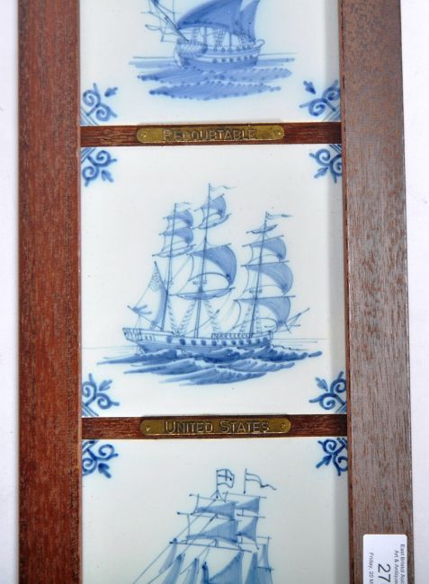 A set of five 19th Century Delft tiles hand painted in blue and white depicting nautical ships. Each with brass nameplate reading Amilia, Nonsuch, Redoubtable, United States & another. Set within an oak long frame with brass corners. Measures approx; 74cm x 19cm.