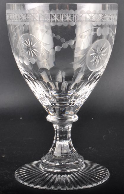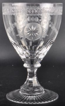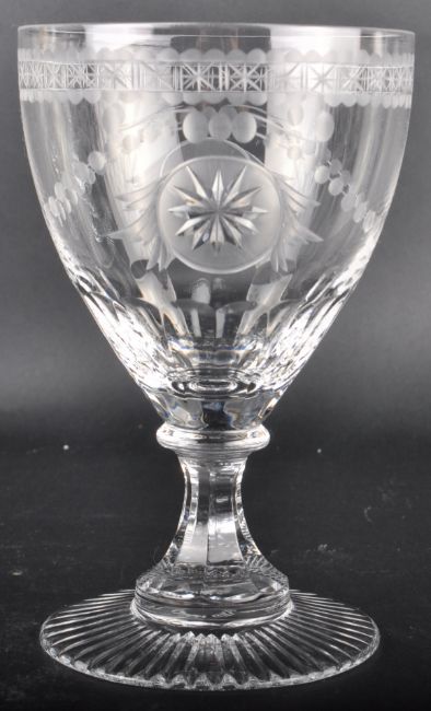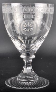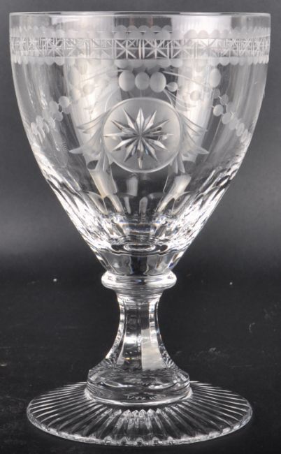 A set of four William Yeoward cut glass wine drinking glass / footed tumbler having a star & bead engraved bowl with circular knop and faceted pedestal stem. All raised on circular faceted footed bases. Measures approx; 1cm tall.