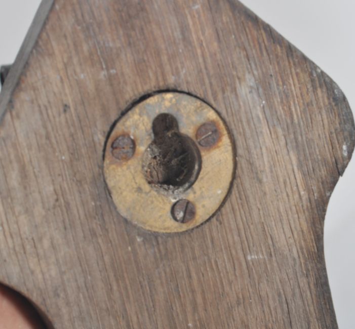 A 19th Century wrought metal Arts & Crafts wrought metal wall light comprising a shaped metal wall arm bracket mounted on wooden base complete with hanging sconce section.
