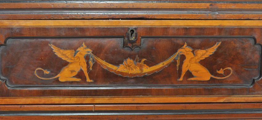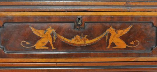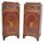A pair of 19th Century mahogany inlaid pedestal cabinets. Both of upright form with sloped pagoda shaped tops and stencilled inlay depicting Griffins, acanthus leaves & frolocking cherubs. Hinged doors opening to reveal fitted shelved interiors below single drawer all raised on bracket feet. Measures approx; 108cm x 49cm x 48cm.