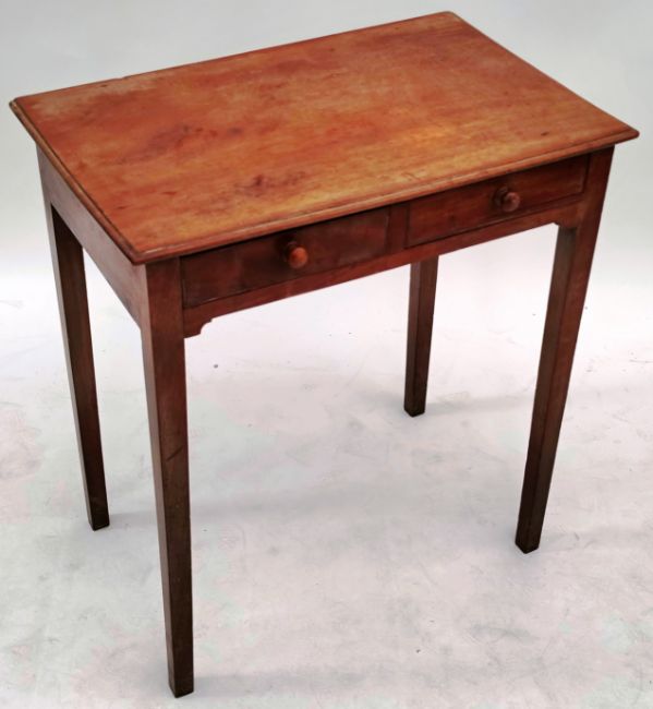 An early 19th Century George III fruitwood twin drawer writing table desk / side hall table. Shaped square top having a chamfered edge above two small drawers having front to back drawer linings with small turned handles. All raised on tapering square legs. Measures approx; 72cm x 66cm x 42cm.