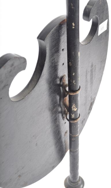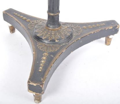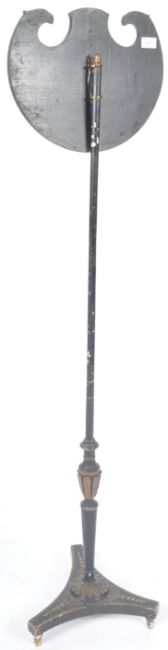 A 20th Century black lacquered pole screen having a shaped panel with chinoiserie scene of figures with a village to the distance. Raised on an ebonised pole upon a trefoil base with gilt acanthus leaf detailing. Measure approx; 140cm x 37cm.