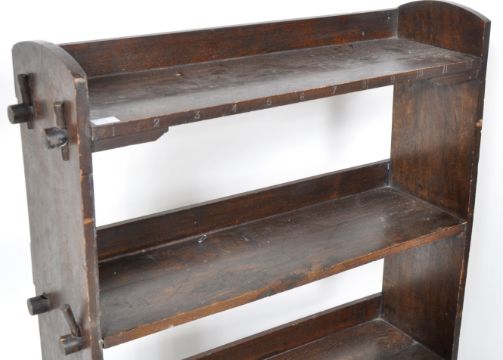 A 19th Century Arts & Crafts peg jointed oak open window bookcase comprising of four fitted shelves with peg joints, arched tops to the sides raised on shaped legs.