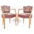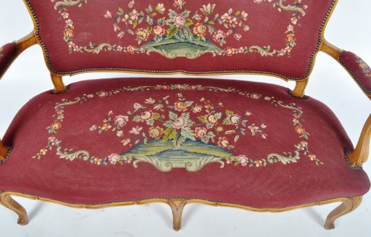 A 19th Century Swedish three pieces walnut framed salon suite comprising of a two seater sofa and matching pair of armchairs. Each having show wood scroll frames with rouge fabric upholstery with floral decoration with brass studded borders. Each raised on sweeping supports. Sofa measures approx; 92cm x 136cm x 54cm. Each chair measures approx; 80cm x 52cm x 38cm.