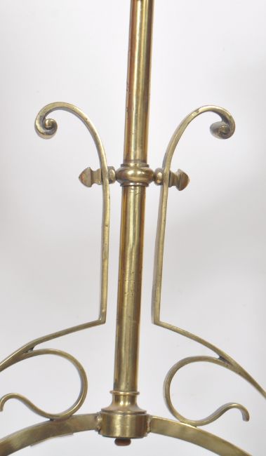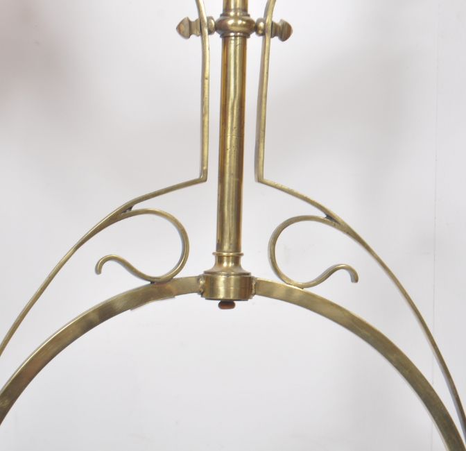 A 19th Century Victorian Gothic brass worked hanging chandelier / ceiling light having a central support and brass band with four scrolled arms supported floral glass shades. Central hanging glass droplets to the central band. Measures approx; 95cm x 87cm.