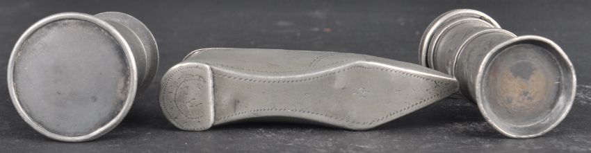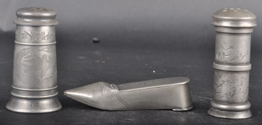 A group of small pewter items dating from the 18th Century comprising two cylindrical sanders / pounce marks with engraved decoration along with a 19th Century novelty snuff box in the form of a shoe with engraved detailing. Measures approx; 8cm wide.