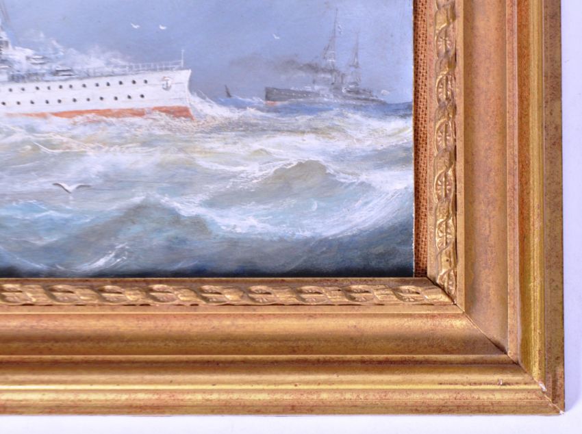 WW Champ - An early 20th Century oil on board painting depicting the ship HMS Barham a Queen Elizabeth Class Battleship with other vessels / boats upon the sea with gulls in flight. Signed by artist to lower right corner. HMS Barham was launched in 1914 and sunk by a U-boat in 1941. Frame measures approx 40cm x 52cm.