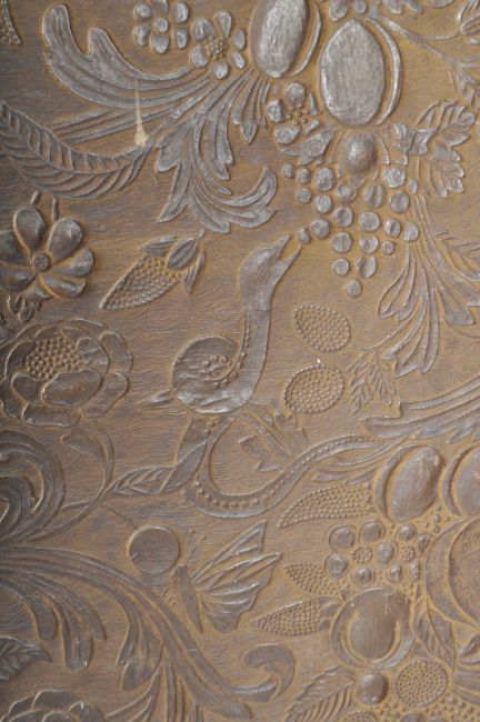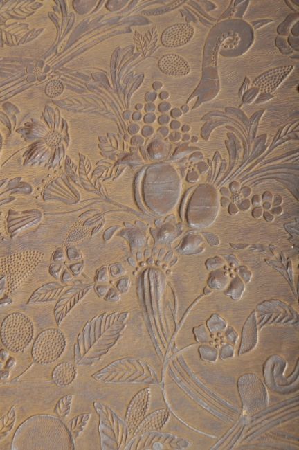 A large 19th Century Spanish country house four fold room divider screen having well worked faux leather panels with floral decoration throughout. Ebonised wood frame with brass studs and brass hinges. Full opened measures approx; 184cm x 248cm.