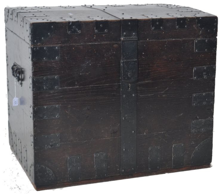 A 19th Century Victorian oak & iron bound silver chest trunk. Large size with wrought iron strapwork set with iron swing handles to sides. The hinged lid opening to reveal a spacious interior. Measures approx; 66cm x 76cm x 53cm.