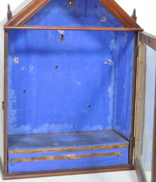 A 19th Century Ecclesiastical Gothic religious wall reliquary cabinet of arched form having a triangular top with single glazed door fitted with a blue and gilt lined interior. Measures approx; 85cm x 52cm x 23cm.