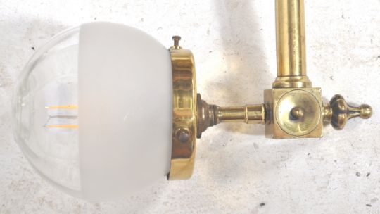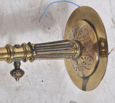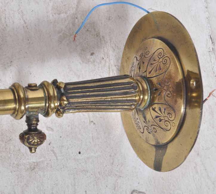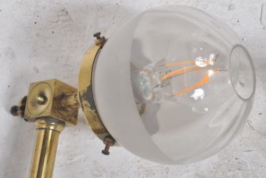 A matching pair of 19th Century Victorian manner brass wall sconces each with acanthus leaf decorated arms supporting glass globe shades. Crica 20th Century. Each measures approx; 32cm.