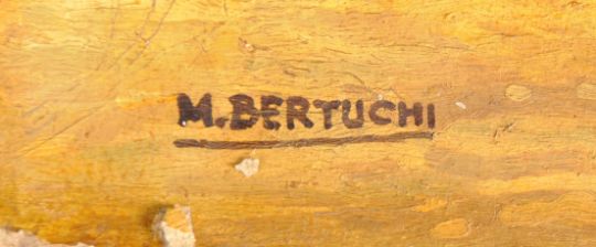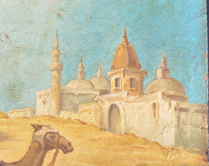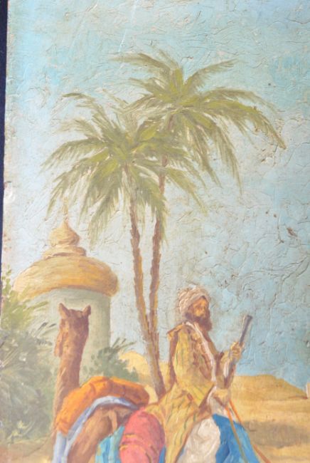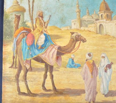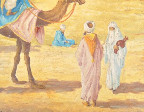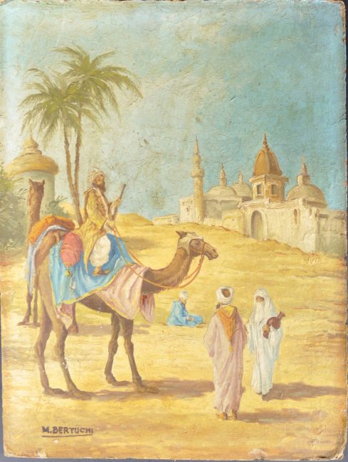 Mariano Bertuchi - (1884-1955) - An early 20th Century Spanish oil on board painting depicting a Moroccan scene with man on camel, women holding vase and other figures in desert with trees and buildings. Possibly a precursor to an early Travel poster. Measures approx; 32cm x 25cm. Some wear to board commensurate with age and being unframed. Signed M. Bertuchi.