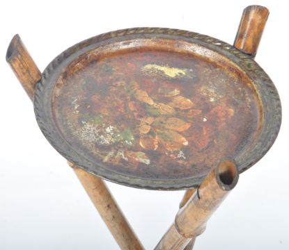 A matching pair of 19th Century Victorian Aesthetic Movement bamboo stands having hand painted circular tin disc tops with floral detailing. The bamboo supports of X-frame form united by lower bamboo stretchers. Wear commensurate with age mostly to the tin painted tops, overall good examples. Each measures approx; 90cm x tall.