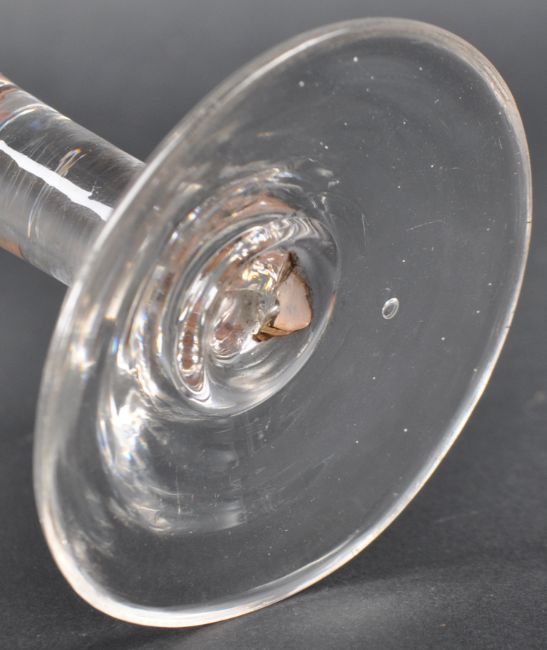 An 18th Century plain stem wine drinking glass having an oval shaped bowl raised on plain stem over conical foot. Measures approx; 13cm.