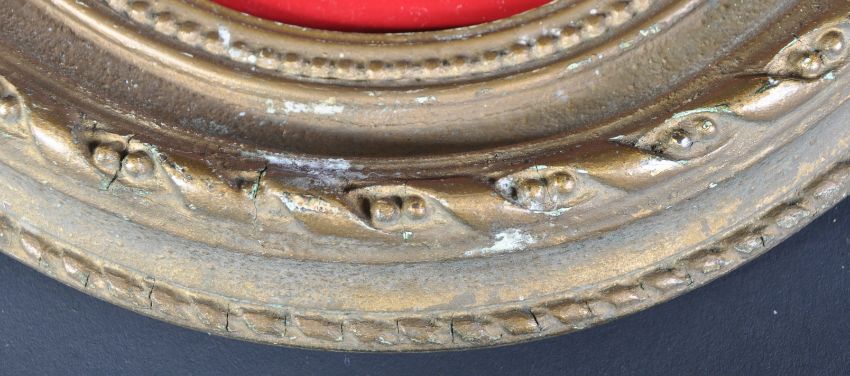A 19th Century bronze ormolu portrait bust of Admiral Horatio Nelson. The applied naval military interest plaque being set to a circular Blue John marble panel within a gilt gesso oval moulded frame. Measures approx; 28cm x 24cm.