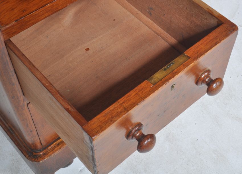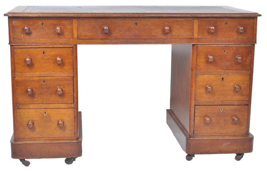 A 19th Century Victorian mahogany twin pedestal writing table desk. Inset gilt tooled leather writing sciver above three drawers raised on two banks of drawers all set on plinth bases. Measures approx; 73cm x 119cm x 59cm.