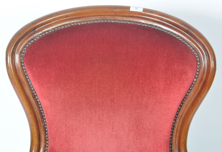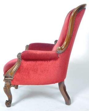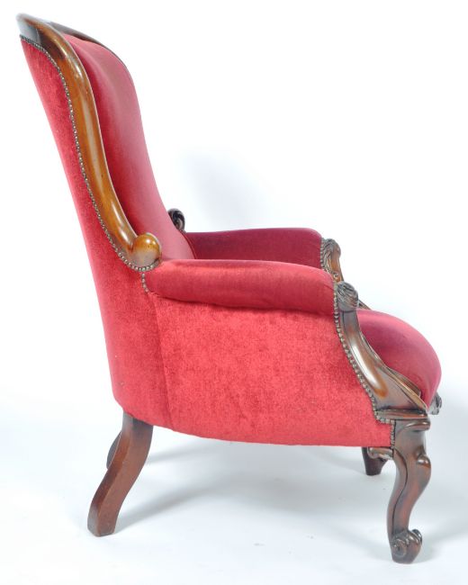 A 19th Century Victorian mahogany framed library reading armchair having a carved show wood frame with acanthus leaf scroll arms and studded borders to the scarlet red upholstery. All raised on carved cabriole scroll legs. Measures approx; 100cm x 70cm x 60cm.