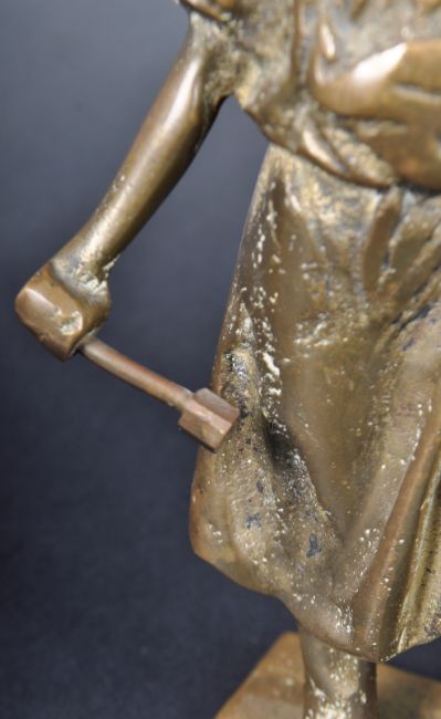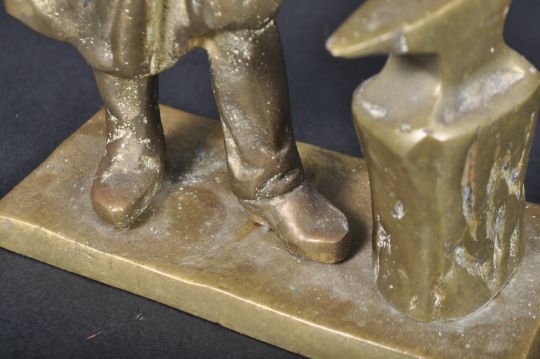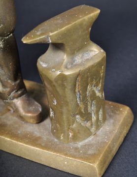 A 19th Century Victorian bronze figurine. The figure depicting a blacksmith standing by anvil with smithing tools in hand. Raised on plinth base. Measures approx; 20cm x 13cm x 6cm.