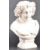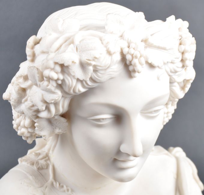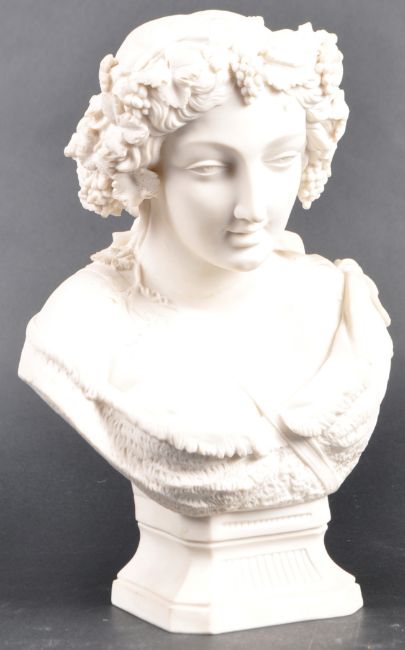 A 19th Century Parian ware portrait bust study depicting a young woman. The woman in classical attire with fruit and leaves set to hair raised on pedestal stand. Measures approx; 26cm tall.