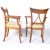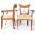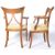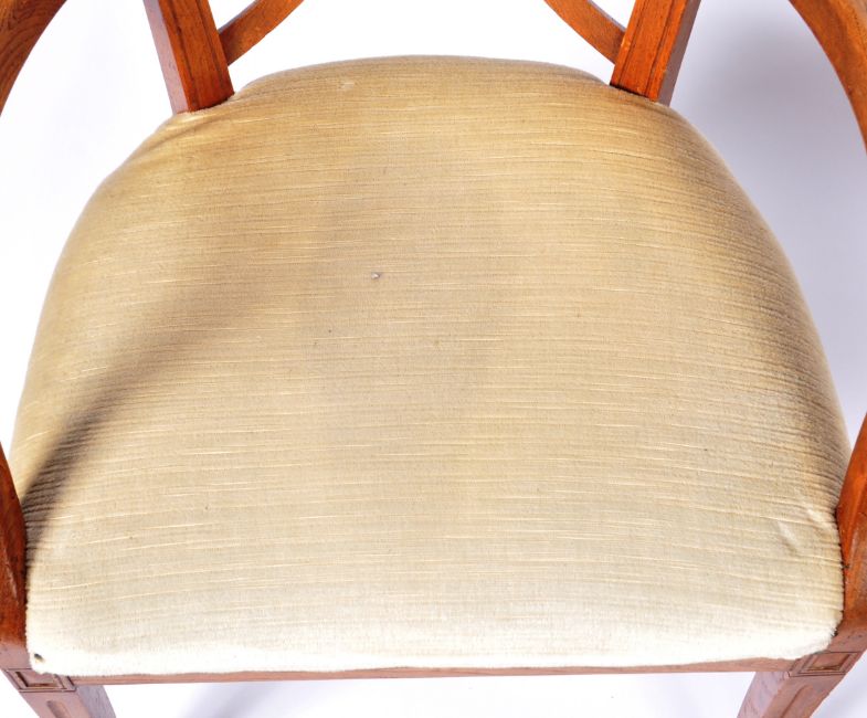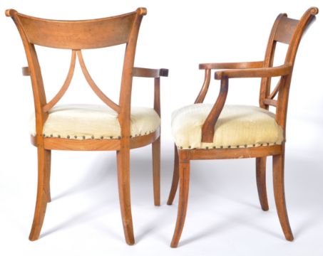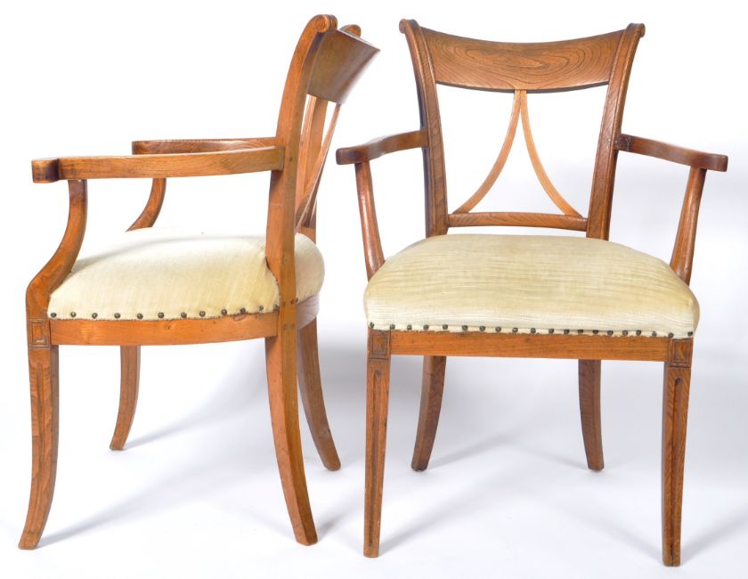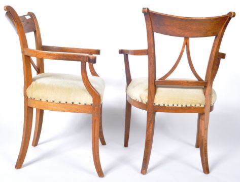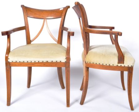 A pair of early 19th Century ash country armchairs / side chairs having triangular set pierced backrests with shaped elbow rests above cushioned seat. All raised on shaped sabre legs. Measures approx; 90cm x 64cm x 54cm.