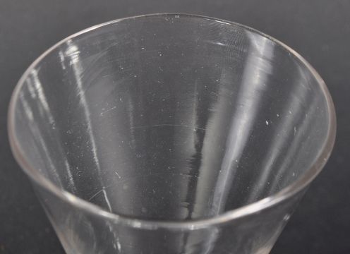 An 18th Century George III flange footed firing glass having a flange foot with tapered bowl and body. No visible signs of major damage. Measures approx; 9cm tall.