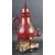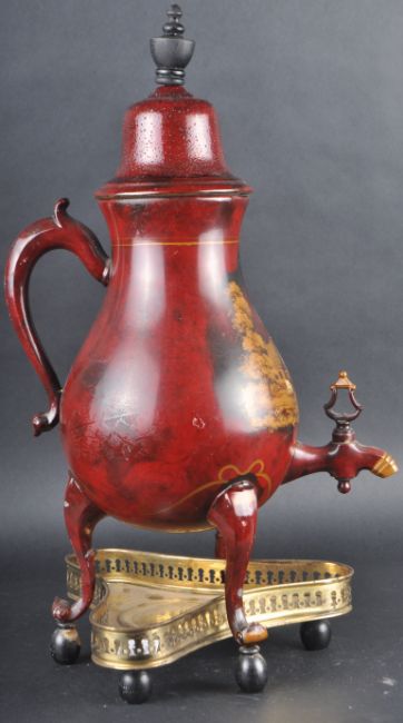 A 19th Century Victorian red lacquered coffee pot and stand having and ebonised finial over countryside painted scenes to the center. Raised on cabriole legs upon ebonised feet. Brass tray below with oil burner. Measures approx; 38cm.