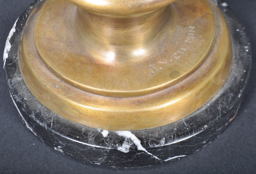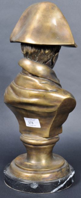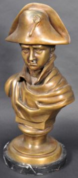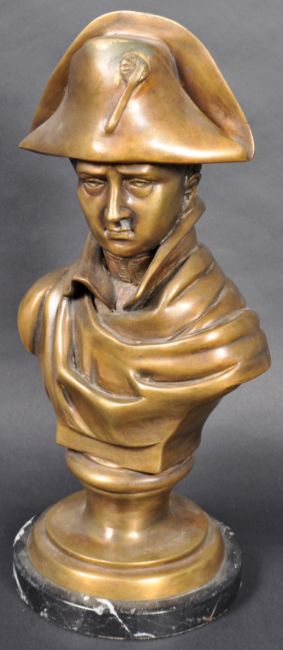 A 19th Century Napoleonic interest decorative bronze bust depicting Emperor Napoleon Bonaparte I. Depicts the French Naval Military leader in typical hat and stern expression. The bust signed JV Chemin. Raised on a black and white veined marble circular plinth. Measures approx; 38cm x 18cm x 16cm.