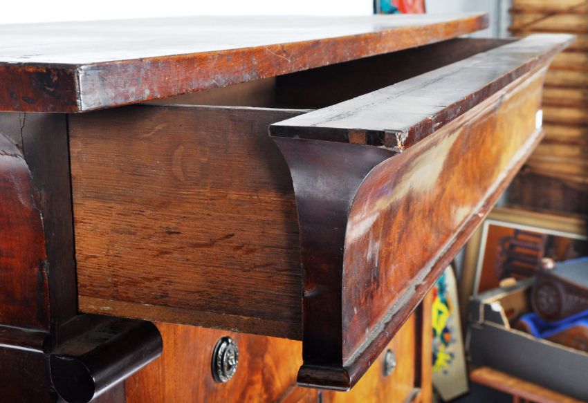 A large 19th Century French Empire Revival mahogany chest of drawers having a flared top with curved fronted drawer below to the frieze. Below a further bank of five graduating drawers with all drawers having lion mask backplates and hoop swing handles. All raised on castors. Measures approx; 160cm x 108cm x 51cm.