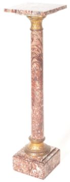 A late 19th Century Victorian mottled red and grey marble urn / jardinière plant / bust stand of simple form having a squared plinth top raised by a single column with brass covers to the top and bottom embossed with classical decoration. Raised on a square stepped marble base. Measures approx; 114cm x 28cm x 28cm.
